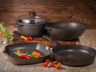 - To the first type carry cauldrons in the form of a pan, they have a non-stick coating. Such cooking containers are not used for a fire, since with strong heating the coating begins to deteriorate and flake off, which is harmful for the body.