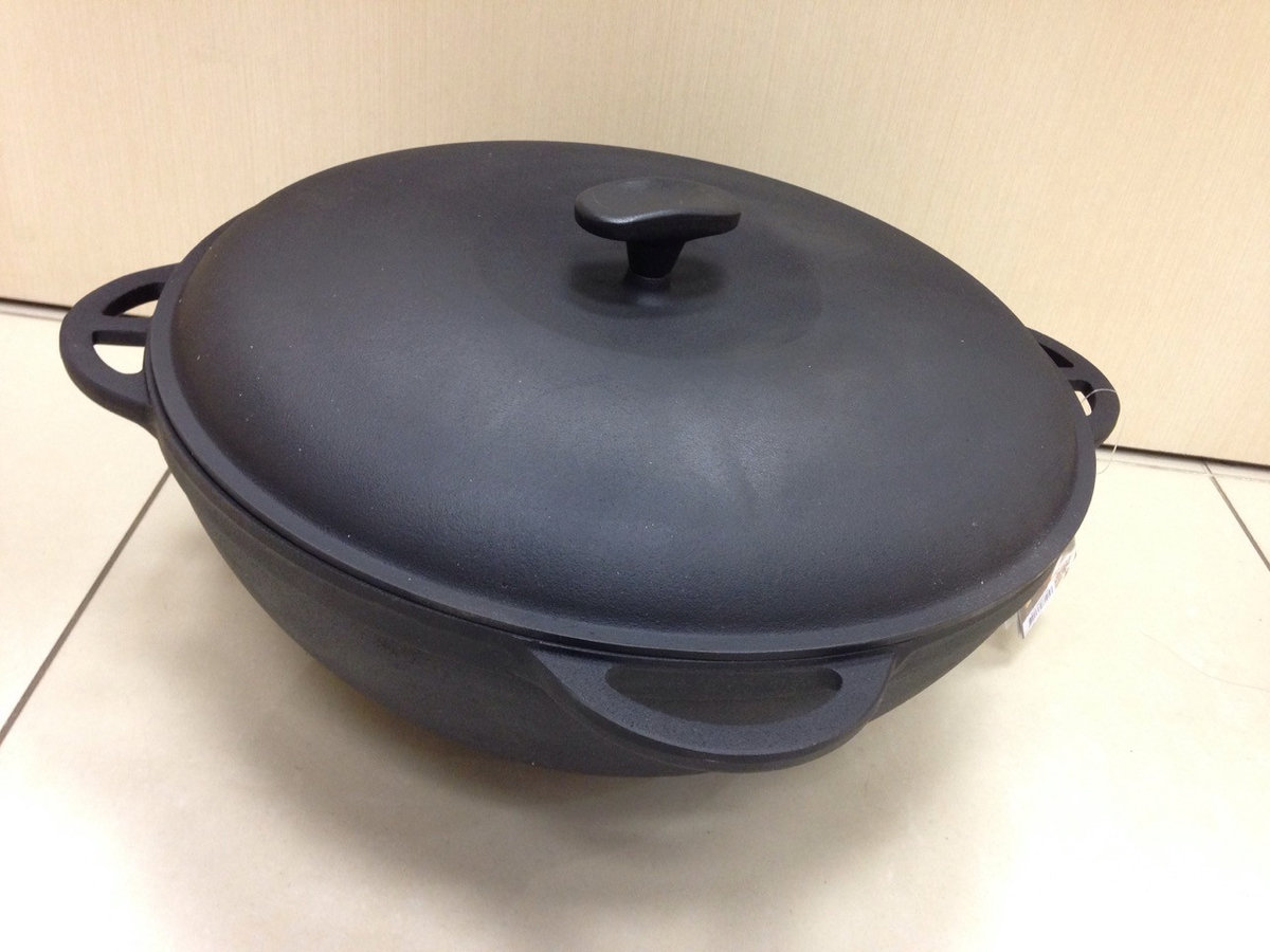 The standard for the choice of material is cast iron, unlike aluminum, it is not so light and mobile, but when choosing a large-sized container of 8 liters it has no competitors. For a large number of guests a volume of 15–20 liters is recommended.