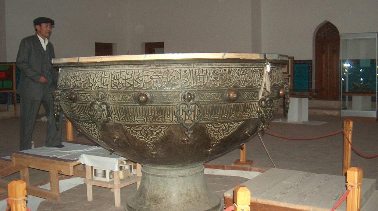 An interesting fact is the existence of the largest cauldron, which is located in the museum of A. Yasavi in Kazakhstan. It has a diameter of 2.2 m and a weight of 2 tons. According to legend, it was cast from 7 metals. It is decorated with an ornament and thanks to the handles it has the shape of a lotus petal.