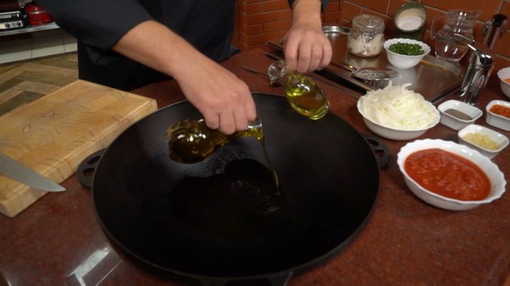 The oil is not used directly in the process of calcining the cauldron, however, it is necessary after the procedure itself. The fact is that the cast-iron tank, after dry roasting in the oven, on the fire or with the help of salt, needs good lubrication for high-quality work. This grease primarily protects the device from rust, and also makes the porous surface of a cast-iron cauldron smooth and non-stick.