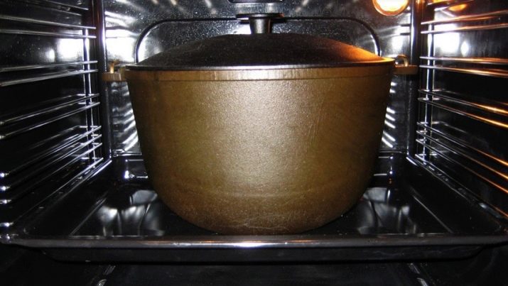 The fact is that during the treatment of the cauldron in the oven, a huge amount of toxic fumes from technical oil is released.