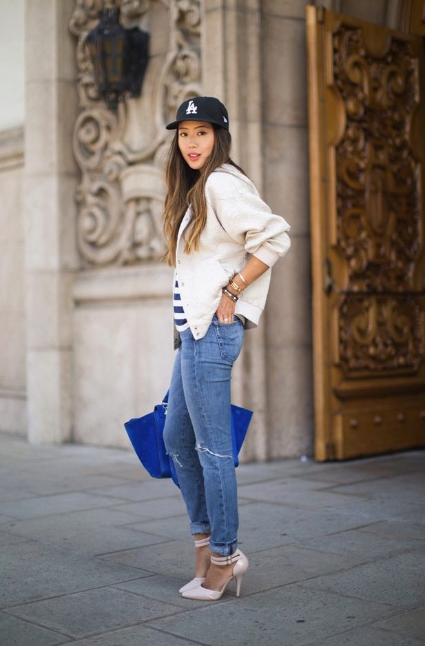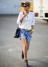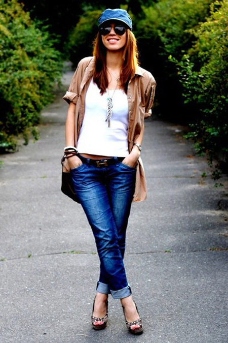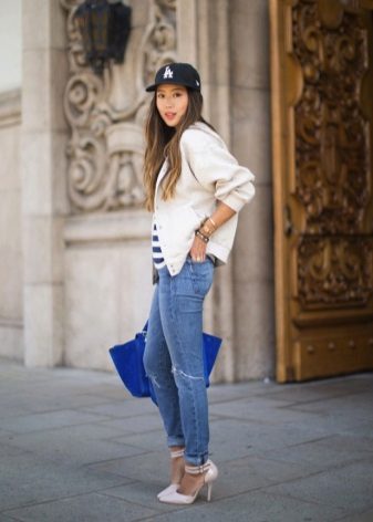 - A denim cap will go well with the clothes that are perfectly suited for the weekend - blue jeans with cuffs, a white T-shirt and a long cappuccino-colored shirt. Shoes with heels will give an image of femininity, and small accessories in the form of bracelets will perfectly complement it. Outfit is ideal for walking or meeting friends in an informal setting.