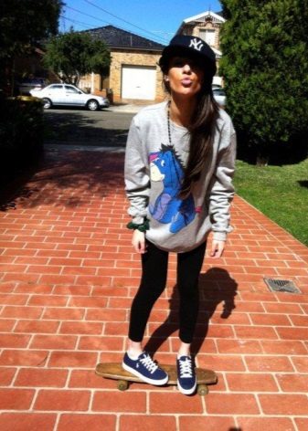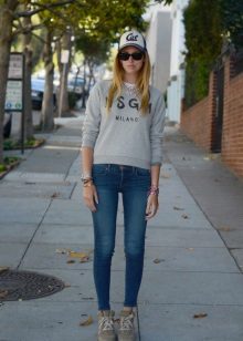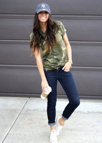 Baseball caps or straight caps are usually chosen for a sporty look. They are perfectly combined both with jeans, and with shorts from different fabrics. Shirts, T-shirts, a variety of T-shirts and sports sweaters will do as well. As for shoes, the choice is not limited here.