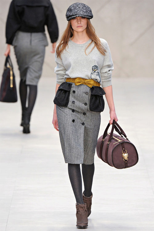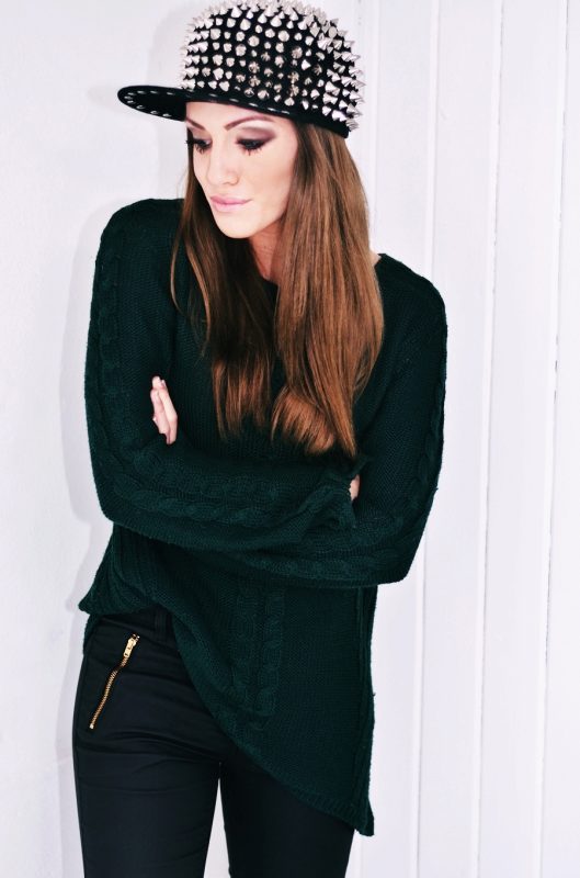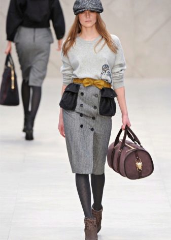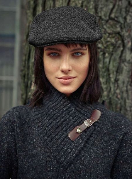 - A dark gray wool flat cap can be combined with a thick sweater of the same shade. Add brown and black skinny trousers, stylish boots with thick heels, decorated with lacing, as well as small accessories in the form of a belt, bracelets and a handbag, and you can safely go for an autumn walk.