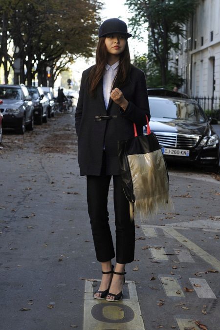 - Unusual, but at the same time, a business image can be created using a combination of a straight black felt cap, oversized coat, straight-leg black trousers and heeled shoes. Under the coat is better to wear a classic white shirt, and the severity of the image diluted with an unusual large bag with light-colored fur trim.