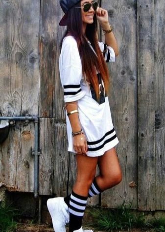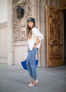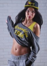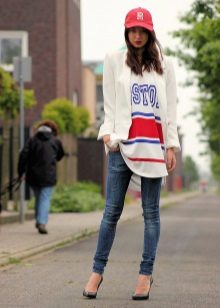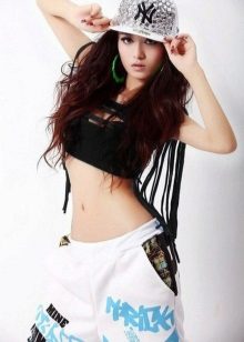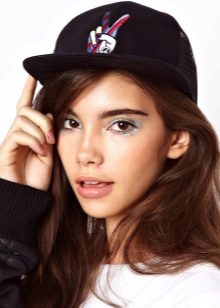 Depending on preferences, the top can be tight-fitting or straight, shortened. The rapper cap looks great with a short sporty dress. The cap can be combined with leggings and an elongated top of the free cut, which can be complemented with classic shoes with high-heeled pumps.