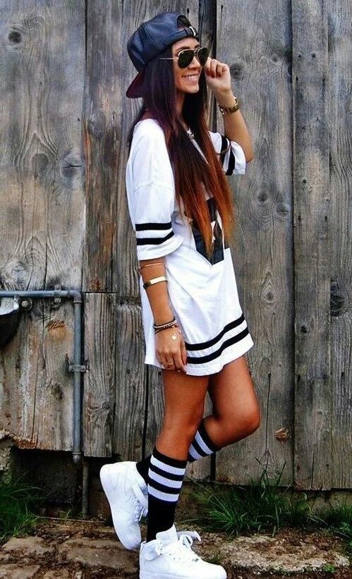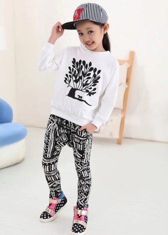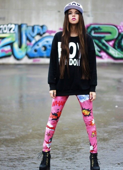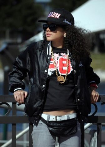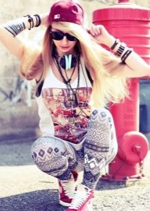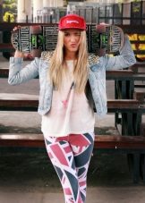 For extravagant girls who like to attract attention, there are also interesting solutions. At the heart of the fashionable image can be leggings of a gold metallic color and an elongated black top with a loose fit. A stylish rapper cap with golden embroidery will succinctly fit into such a bow. High lace-up boots further emphasize slender legs and add brutality to the image, balancing the top and bottom. Wear a bomber jacket and pick up accessories in the color of the set, it can be black and gold bracelets.