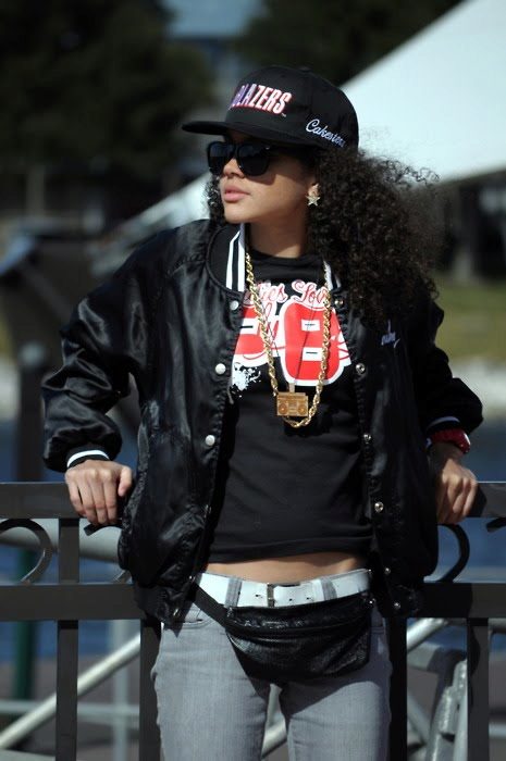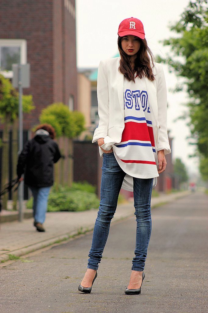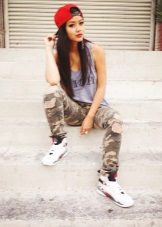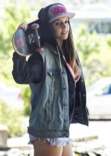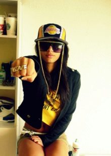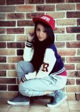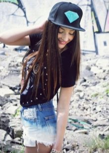 Rapper cap looks harmoniously with jeans shorts and jeans of various models, such as skinny or boyfriends. In the summer, such an image is complemented with a single-colored T-shirt or a printed T-shirt, in cooler weather - with a sweatshirt, hoodie, sweatshirt, denim shirt or a checkered shirt. In the autumn, fashionable women prefer shorter leather jackets, bomber jackets and windbreakers. The rapper cap is combined with a tracksuit or sports trousers with a top.