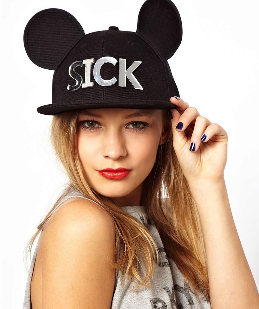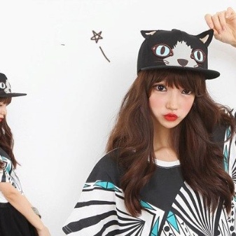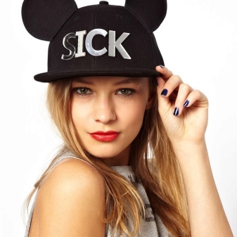The most unusual designer find is the hip-hop cap in the form of a cat: the corresponding print on the front, eyes, stripes and ears with pointed corners on the top of the headdress. There are caps decorated with mickey mouse ears.