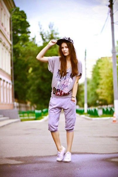 In other cases, shoes, it is desirable to choose a flat sole - sneakers, sneakers or sneakers. You can complete the image with accessories that match the style and color: bracelets, wrist watches, large earrings, chains or a scarf.