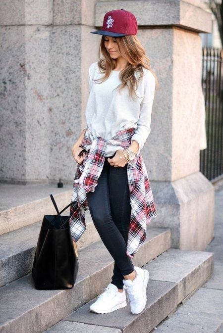 In order to create a modern urban look, just put on tight jeans, a free knitted jumper and complement it with a loose-fitting checkered shirt. A rapper cap will successfully complete this set in the same color scheme as the print on the shirt. Shoes should be neutral, it is better to give preference to comfortable white sneakers. Take along a soft, voluminous leather bag and don't forget about accessories. Wrist watches and a thin bracelet of golden color will look great in this look.