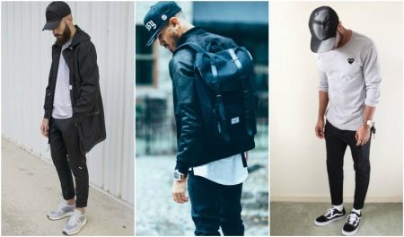 To create a stylish casual look that is appropriate both in the daytime and in the evening, men can combine a cap with a wide straight visor with a cropped leather jacket or park, a classic white or other light-colored monochrome shirt, narrowed trousers or jeans and large wrist watches. An excellent addition to the image will be a rectangular backpack, made of leather or thick materials that keep their shape well.