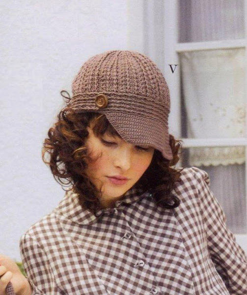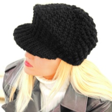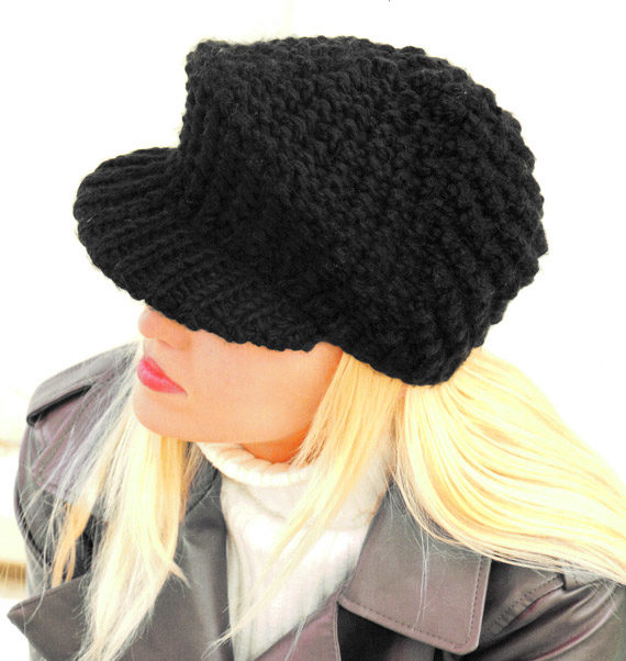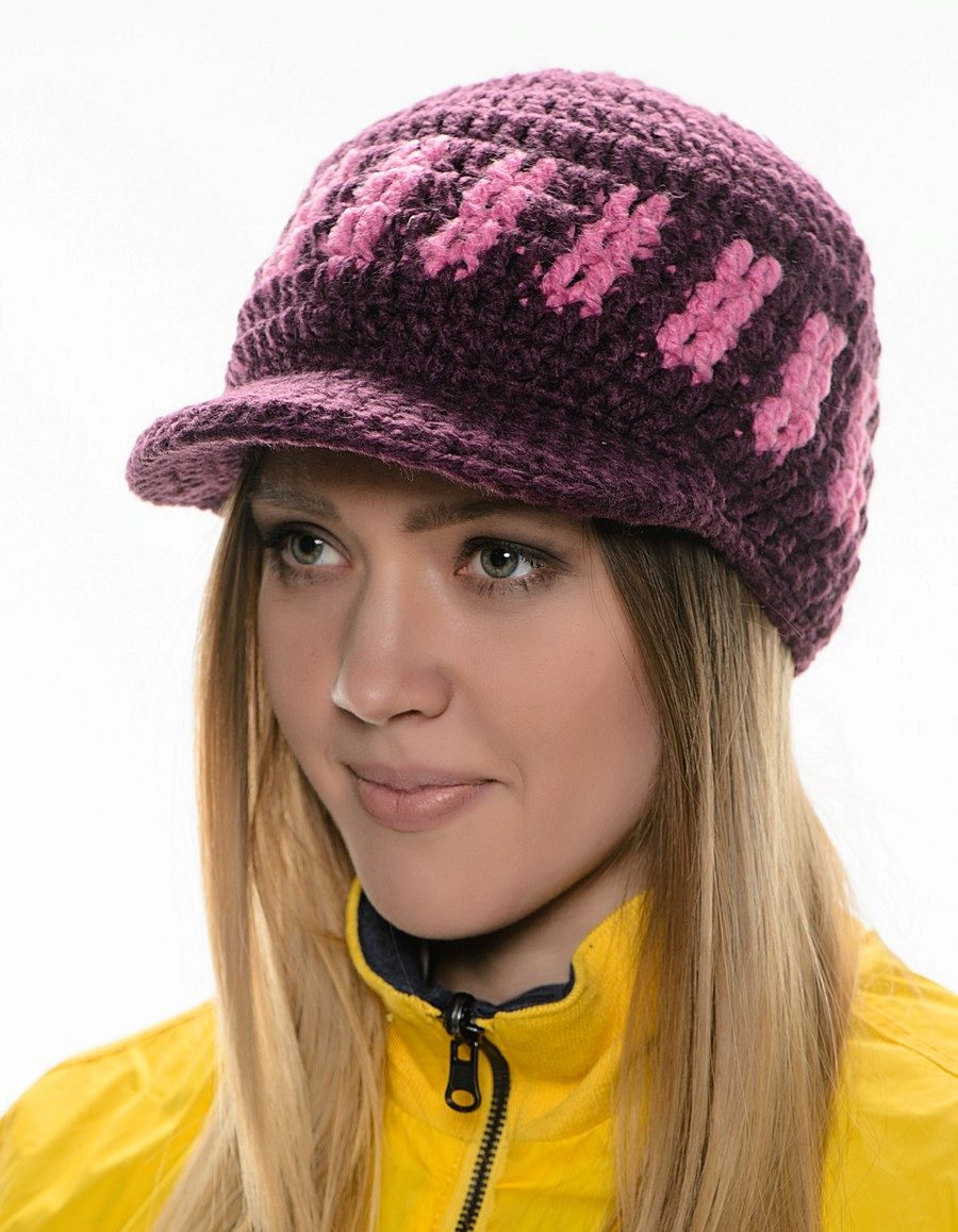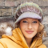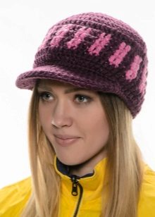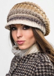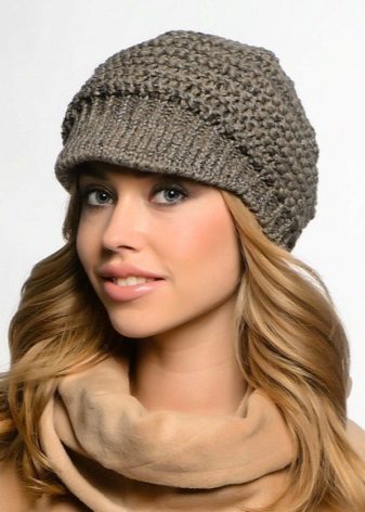 - Volume knitted cap with a small visor. As a rule, such products are made of thick yarn or double-viscous, have large patterns.