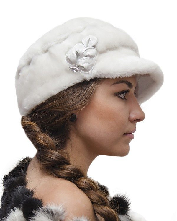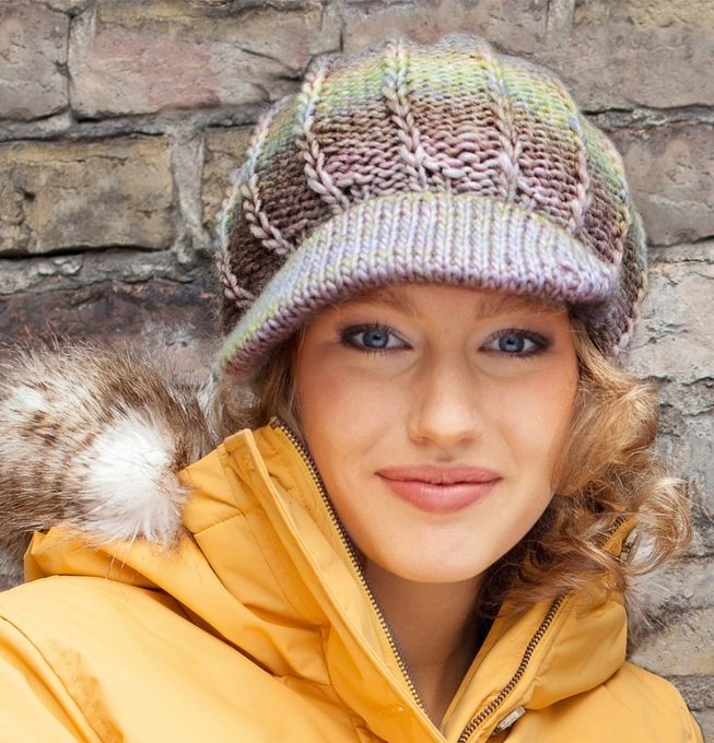 Charming knitted cap made of melange yarn, which always looks interesting. The volumetric model fits the features of the girl’s face and her fluffy hair. The product is made simple viscous, based on the alternation of facial and purl loops, a small visor is connected by a rubber band. After all, melange threads in beige-brown colors are beautiful in themselves and do not require any intricate patterns. The cap is decorated on the side with a beige button. The image harmoniously complements the same knitted warm sweater with a high neck and light fur outerwear.