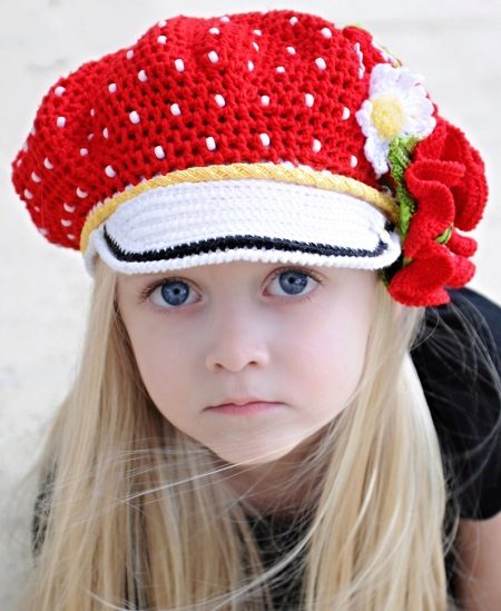 An adorable headdress for a baby at the end of spring and beginning of autumn. The main part of the crocheted cap is made in bright red with white dots. The miniature visor is tied with white threads and has a black border. The side of the product is decorated with chic white and red flowers. The black shirt of the girl is combined with a fringing on the cap. And the red color always goes to blondes, even so small.