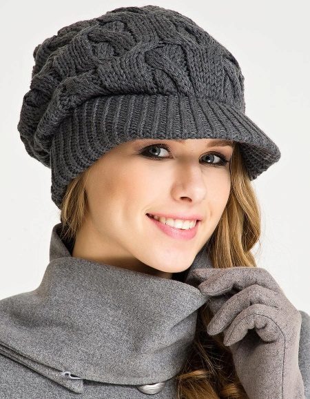 Model of a similar style, with a massive top and a neat visor, but already monochromatic of a beautiful graphite hue. Here the pattern of the intricate weave of the braids is completely appropriate - it makes the knitting volume. The rest of the clothes are made in lighter gray colors (coat and gloves), which is surprisingly in harmony with the girl's light brown hair.