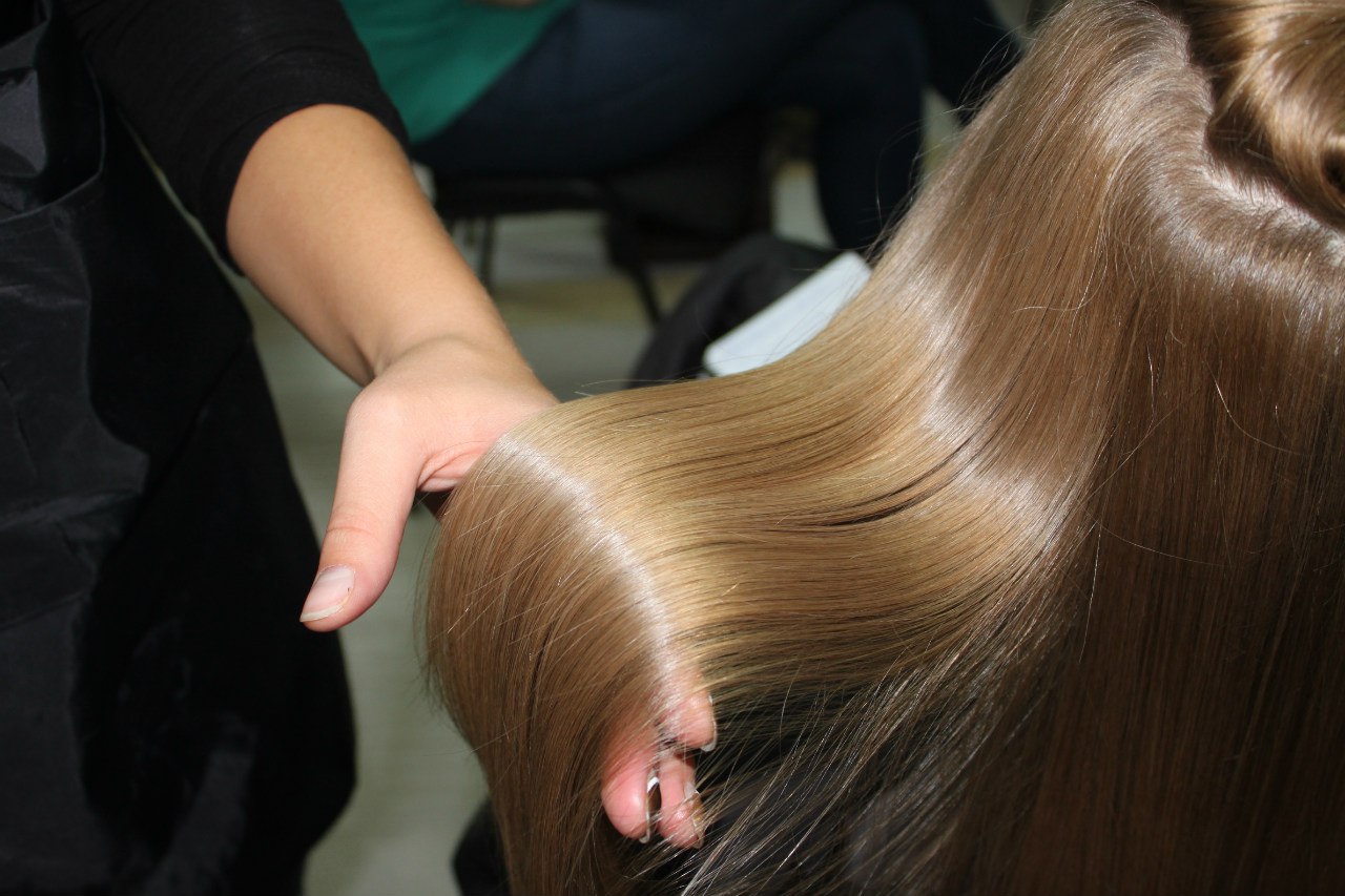 - after application and distribution of the composition, each individual strand is dried with a hair dryer or ironing at a temperature of 230 degrees C, which causes the protein to combine with human hair.