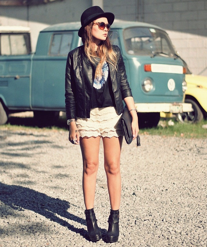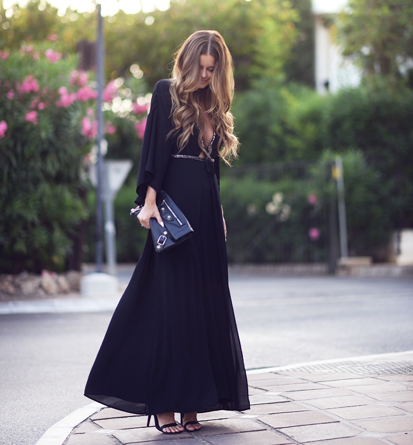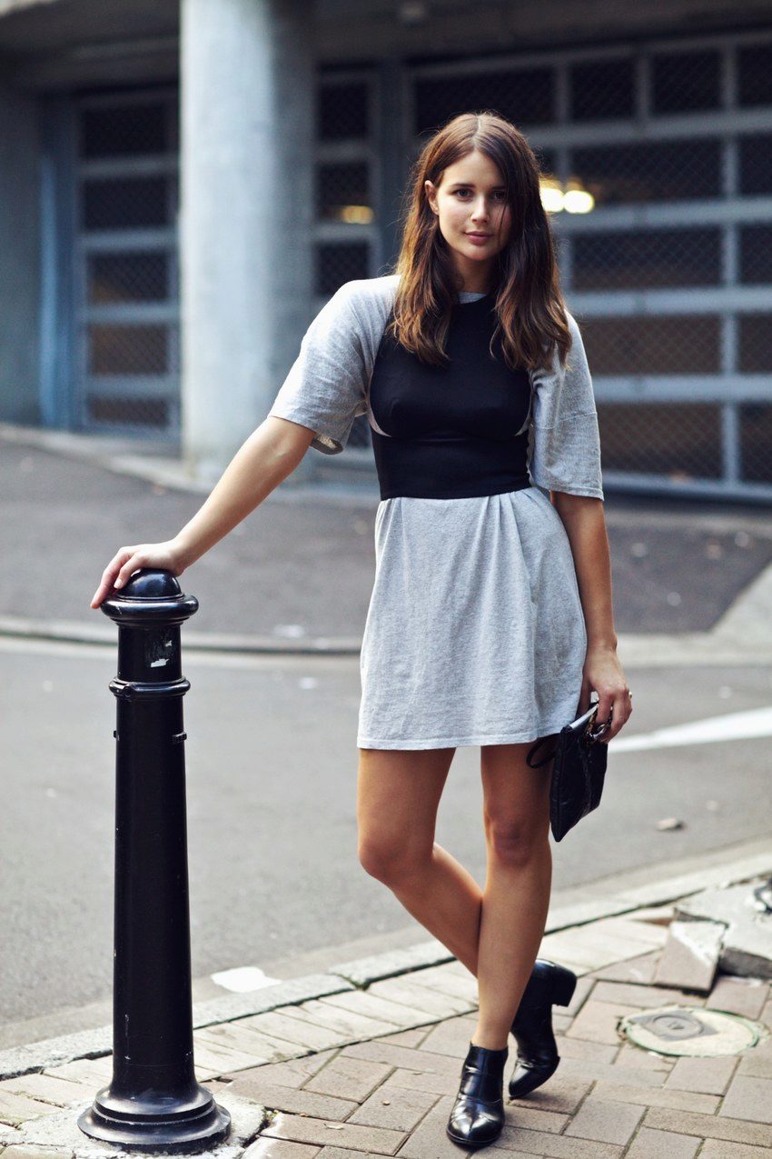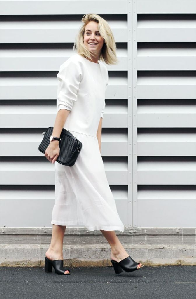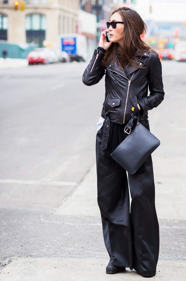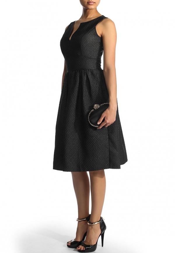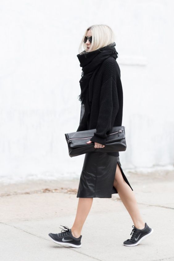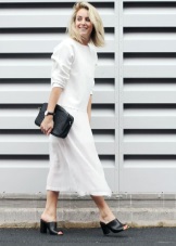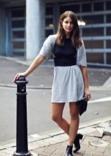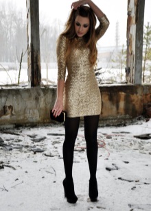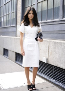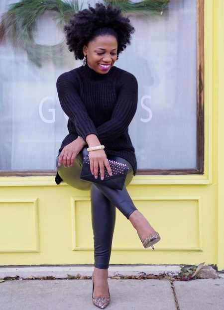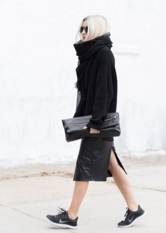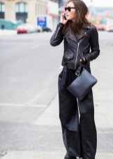 Always relevant image Total black. A classic sheath dress in combination with a black leather jacket and half boots on a small heel complements the black clutch. This outfit would be appropriate in the office without a strictly dress code, and at a magnificent party.