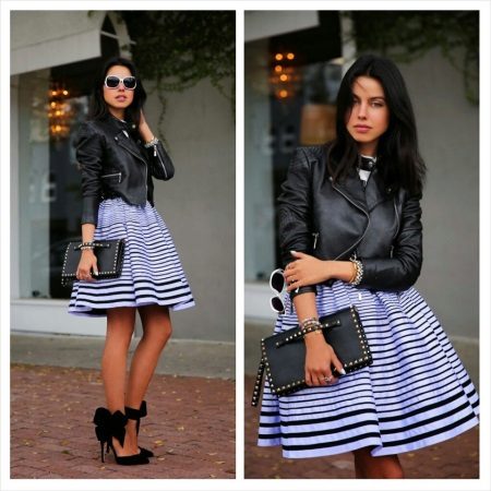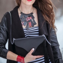 An image in black and white that combines both a rough and romantic style. Elegant Valentino shoes with a bow, black cock-jacket and a soft black-and-white striped skirt. The image is complemented by an envelope clutch with metal jewelry and metal bracelets.
