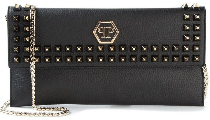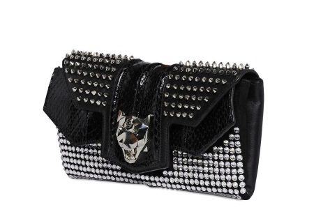 Brand Philipp Plein creates women's small handbags, decorating them with rhinestones and small stones. For example, a very bright version, fully decorated with black rhinestones and a matte lion head. Such a clutch will complement any club outfit. Despite the fact that it is completely made in black, it looks bright and stylish.