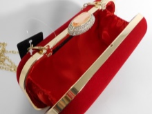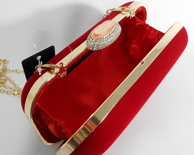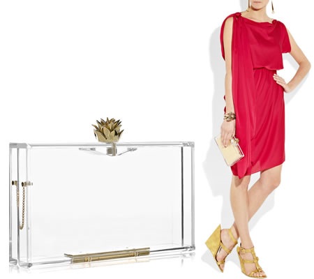 A transparent clutch is perfect for a red evening dress and golden sandals. It is better if you see a golden clutch inside it. Then you can wear a gold-colored jewel on your wrist.