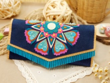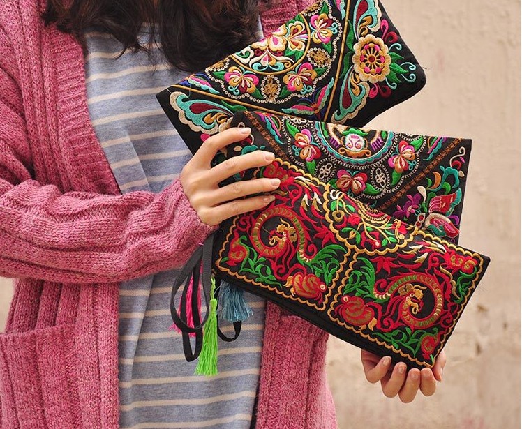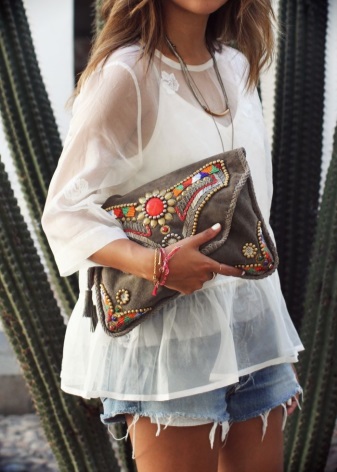 - Clutch in the style of boho is quite capacious. It is characterized by a motley color with different ethnic patterns. This clutch should be worn with appropriate bright clothes.