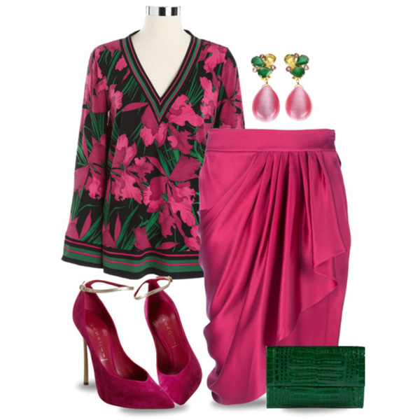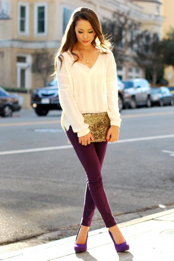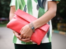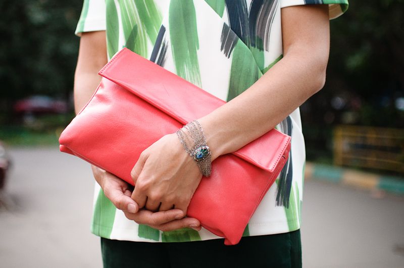 Coral or green clutch will help to dilute the boring office style, as long as it fits well with your image in color and decor. These colors will highlight your bright image. They are indispensable in the evening image.
