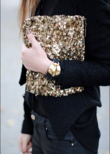 Gold or silver clutch looks good with an evening dress and decorations of the same shade. Shoes can be selected in black.