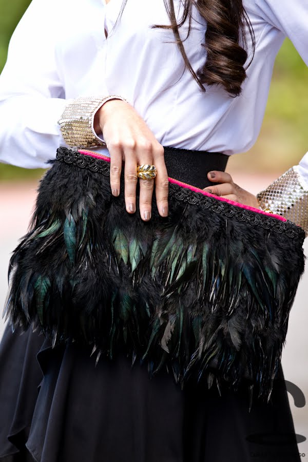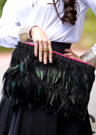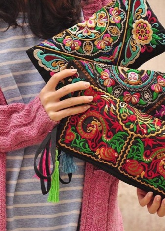 The clutch with feathers and fringe is best suited for a dress with appropriate inserts, if we are talking about evening dress. With daytime clothes, everything is much more interesting. Fringe is often referred to as retro style, hippie and ethnic style, so this clutch is most often attributed to summer clothes. Like feathers and fringe, an embroidered clutch is relevant for summer. It is foolish to use this decor at other times of the year.