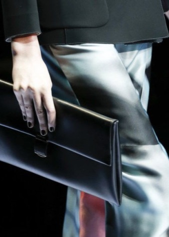 - An excellent option for a business suit would be a clutch bag. His need to choose the color of the suit, so he will dilute the boring office style, emphasize your femininity and will not stand out too much. It should be borne in mind that in case of anything, such a clutch is not suitable for documents.