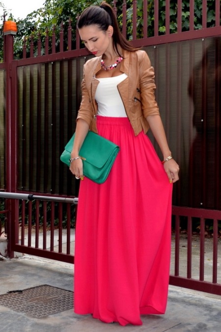 A turquoise clutch will suit a summer skirt to the floor of any color. Best of all, it will look together with a skirt of the same saturated color and a white top on top. The decoration can either be completely absent, or should be chosen to match.