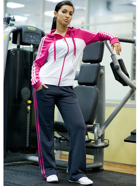 - Being engaged in the gym, every girl wants to feel not only comfortable, but also to be attractive in appearance, so the right choice of a tracksuit is very important. The model of a sports shirt, combining white and pink colors, will be an excellent convenient option, and thanks to its bright colors will attract a lot of approving views. In combination with gray sweatpants, decorated with pink stripes on the sides, the image will look light, sporty and very harmonious.