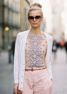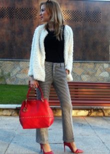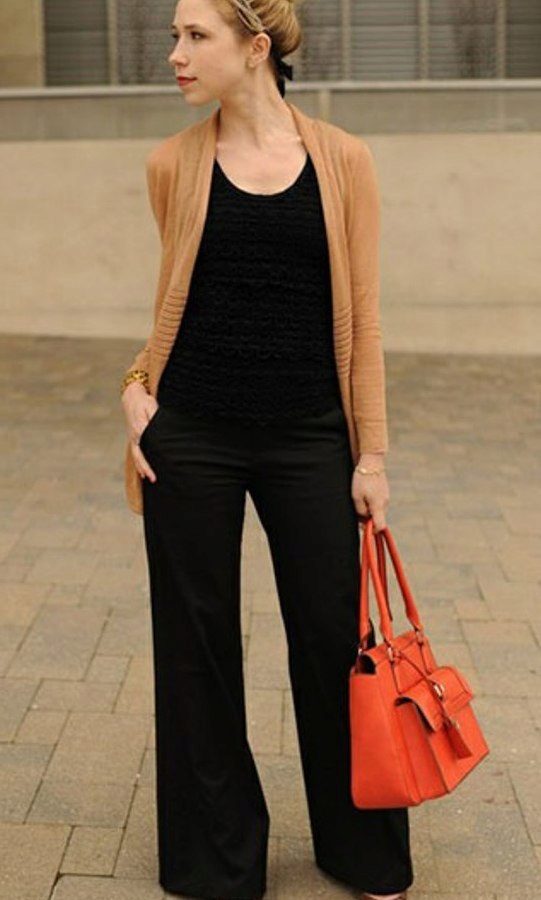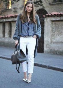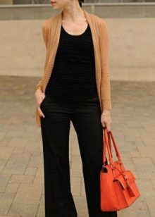 Another variation on the theme of work - straight pants with arrows, shirt or blouse and a cardigan with a belt knee-length.