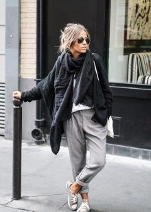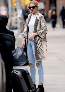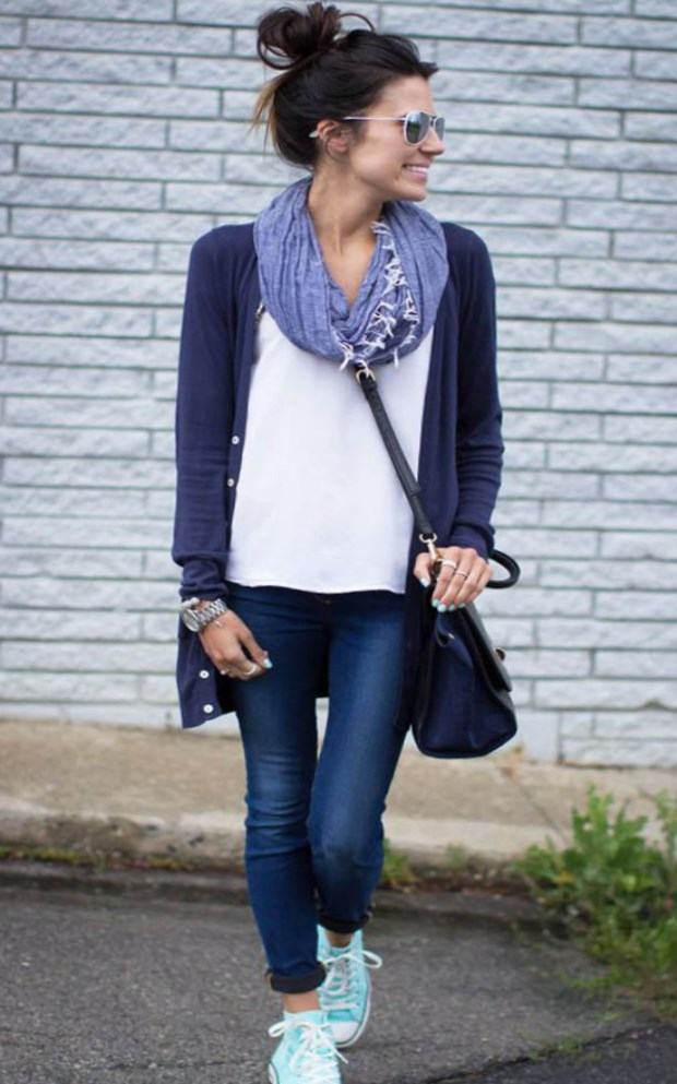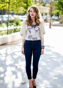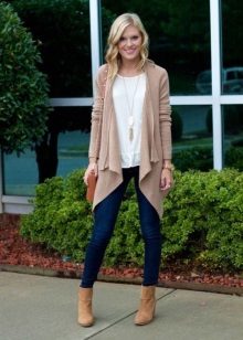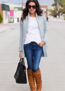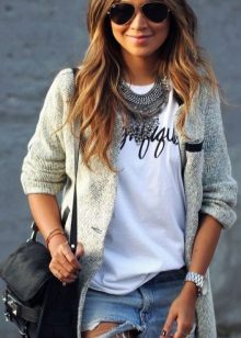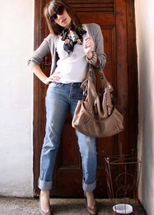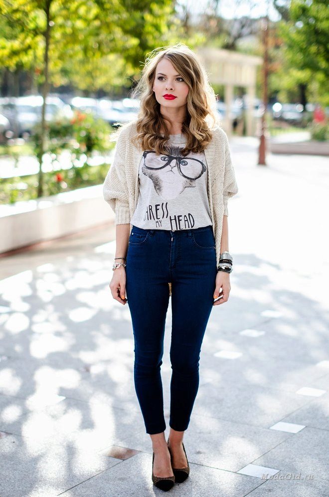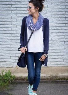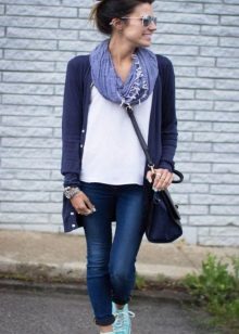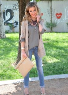 Set number 1 "Casual." We will add jeans, a light-colored T-shirt or a T-shirt to the cardigan with buttons, comfortable footwear on a flat course. You can put on a neck light scarf or a massive bright jewelry.