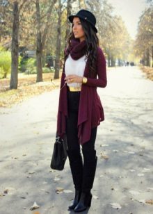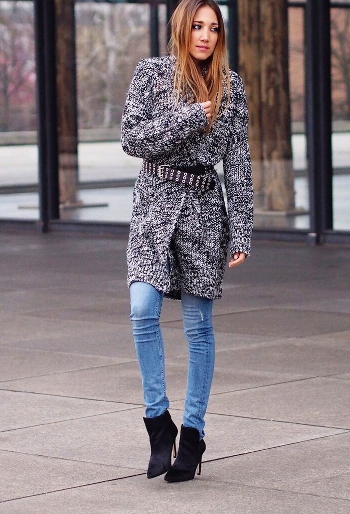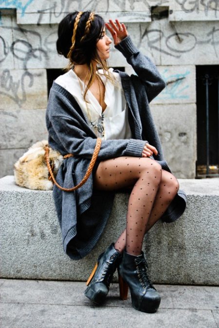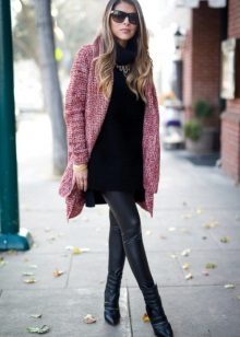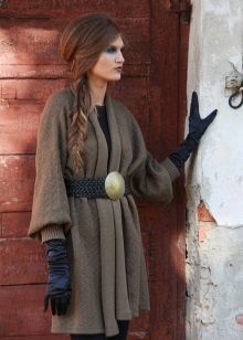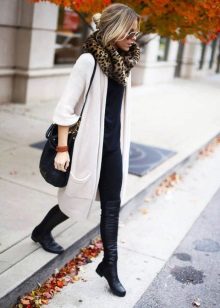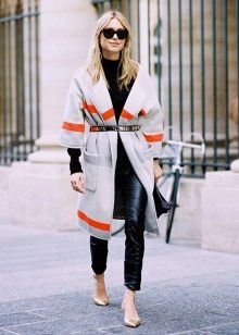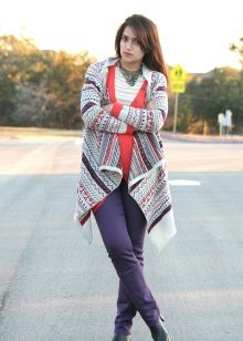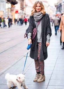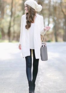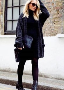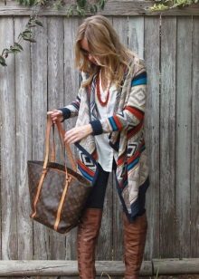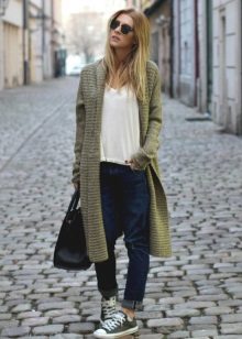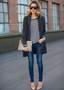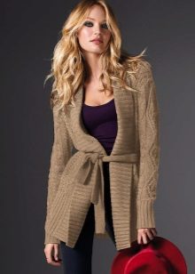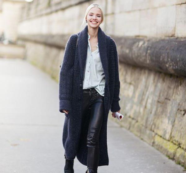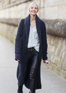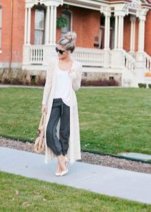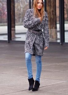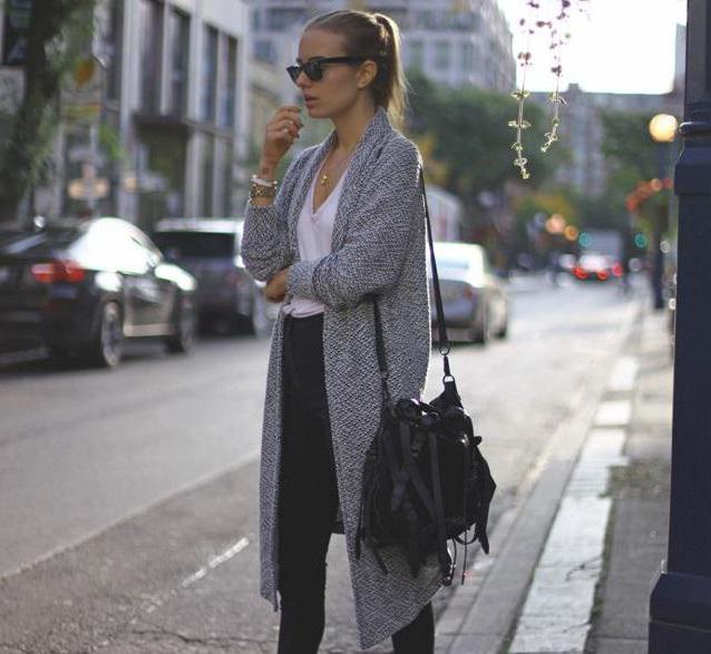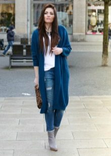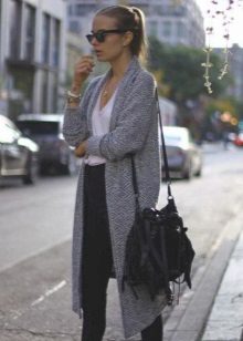 The second place is occupied by an elongated knit cardigan. Looks perfect with skinny jeans, tops, short dresses.