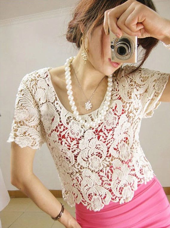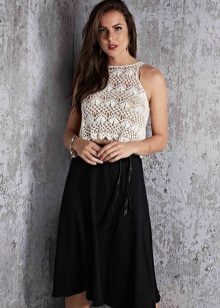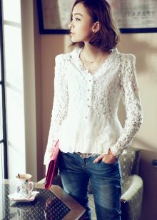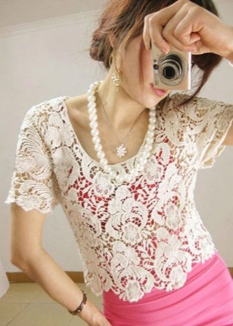 Openwork blouse straight, loose fit perfectly complement jeans or denim shorts. The combination of different materials on the invoice always remains relevant, so this set looks very stylish and elegant. A fitted openwork blouse in combination with a straight pencil skirt will be an excellent option for an office dress code.