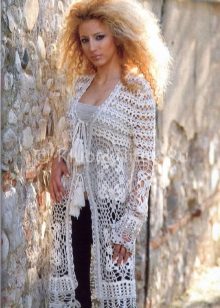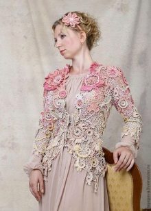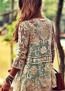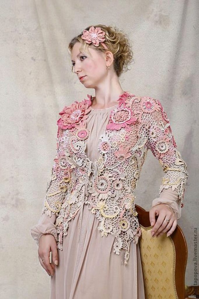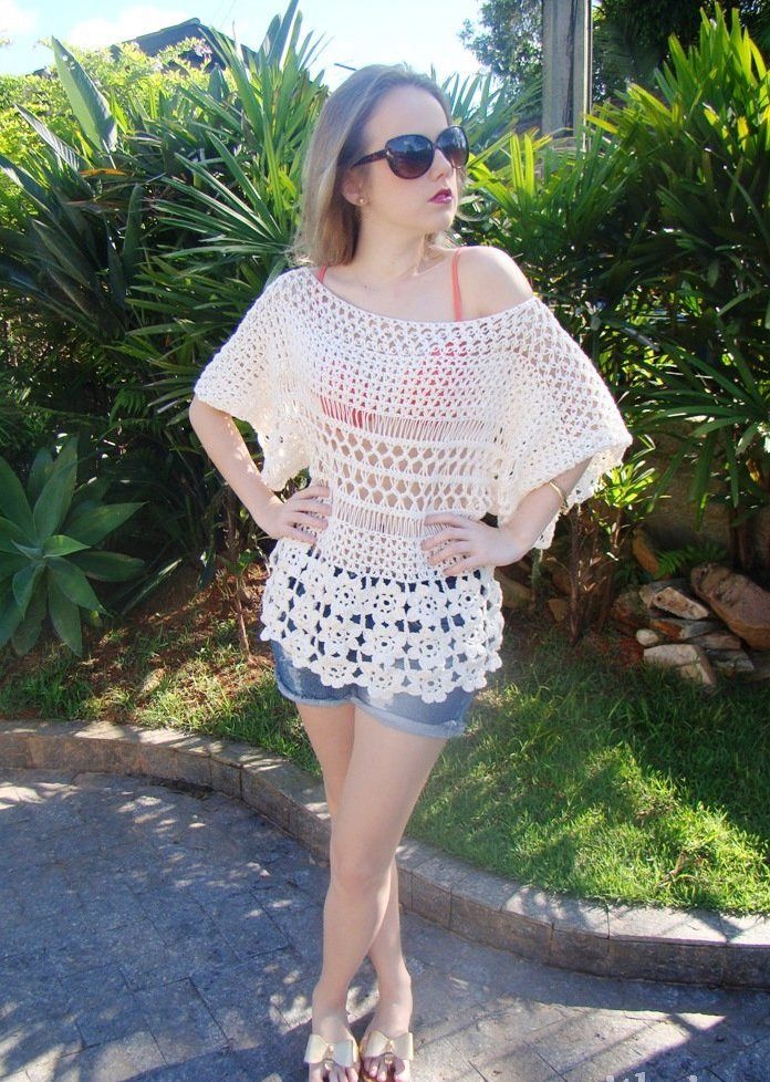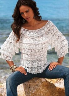Another popular knitting technique for creating summer sweaters is Irish lace. The elements of this blouse are knitted separately, and then connected into a single whole. Most often for an ornament flowers are chosen. Blouses can be monophonic or knitted from a yarn of several shades.