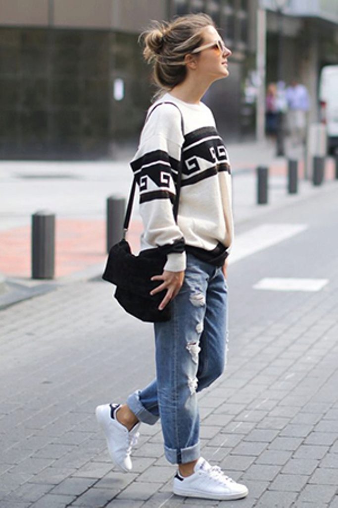 Spectacular outfit for cool weather: a warm knitted sweater, decorated with fur and snow-white jeans.