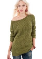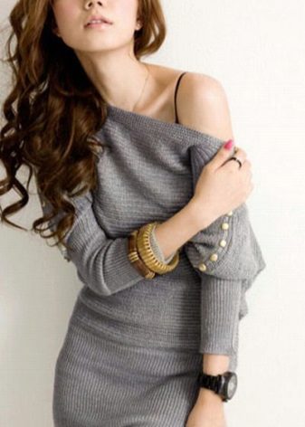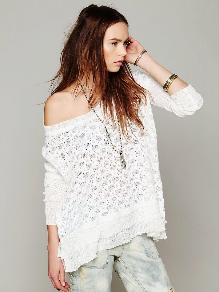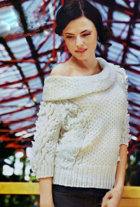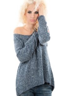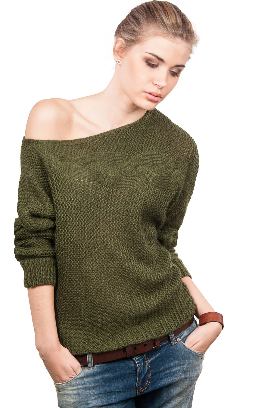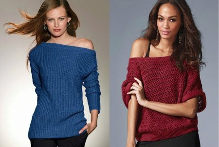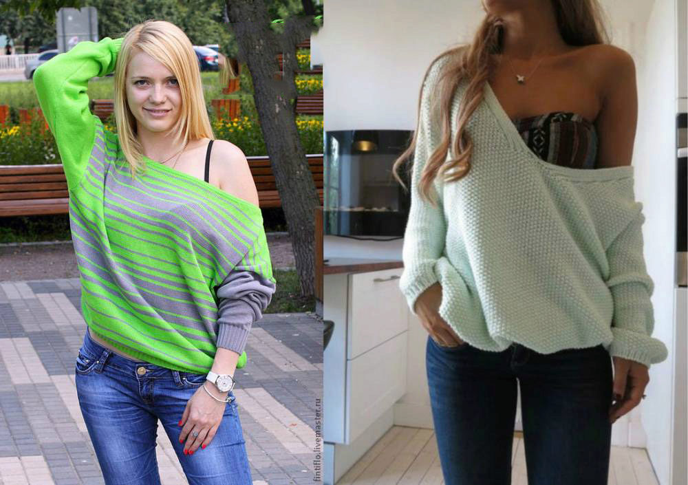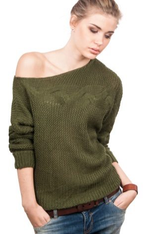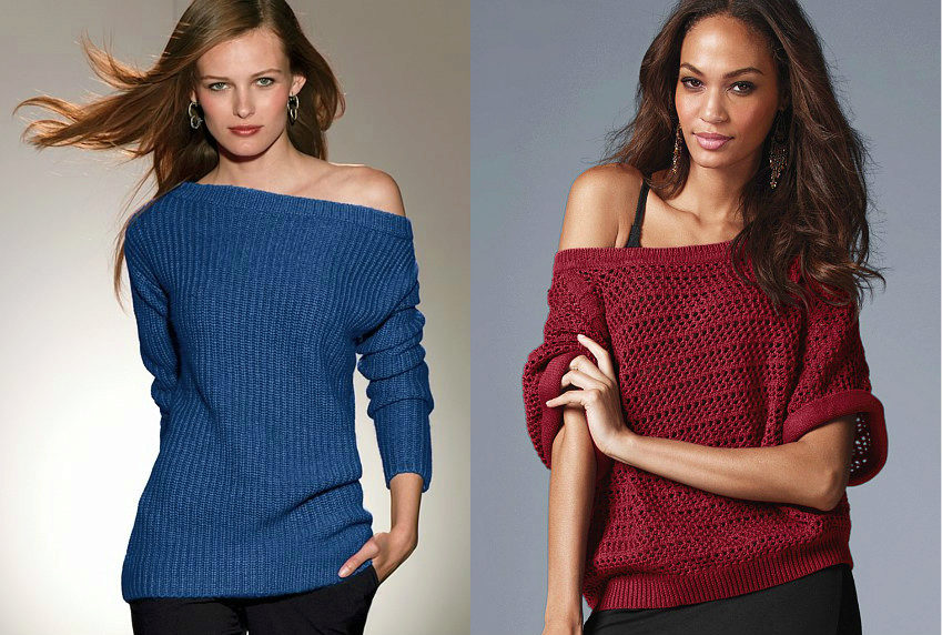 An important rule for an open shoulder sweater is harmony in image and detail.