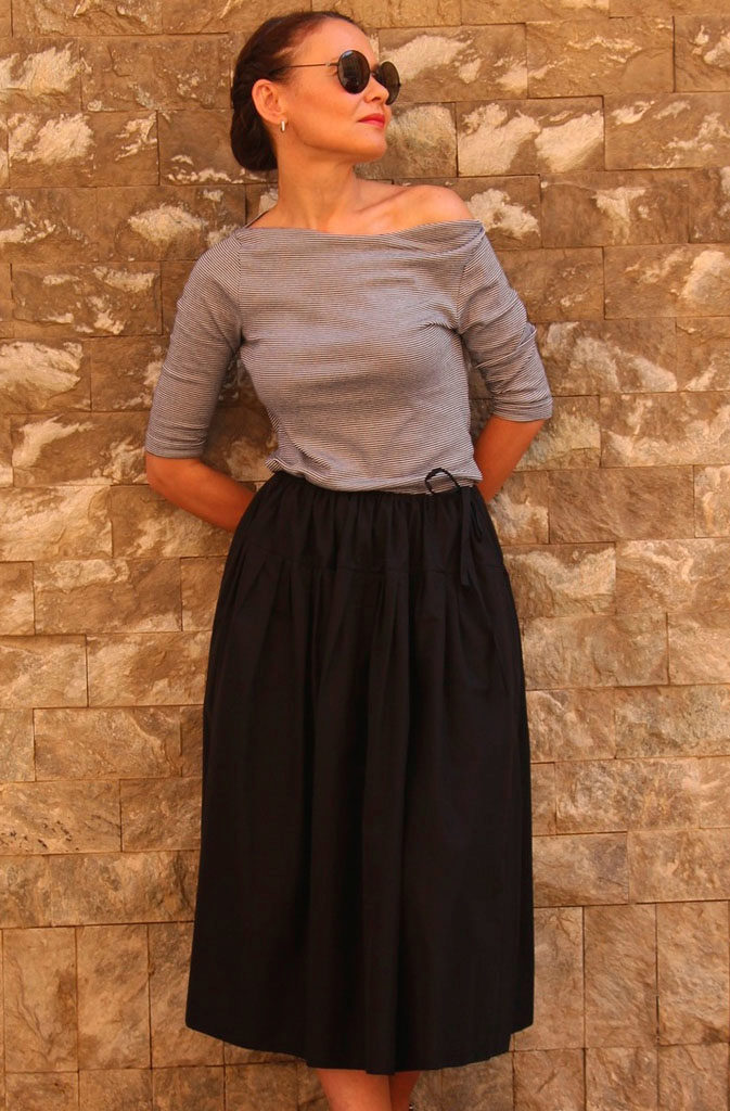 A casual look is easy to make by opting for a black bell skirt on the drawstring and a gray sweater. Minimalism in detail - this is an important detail of your set.