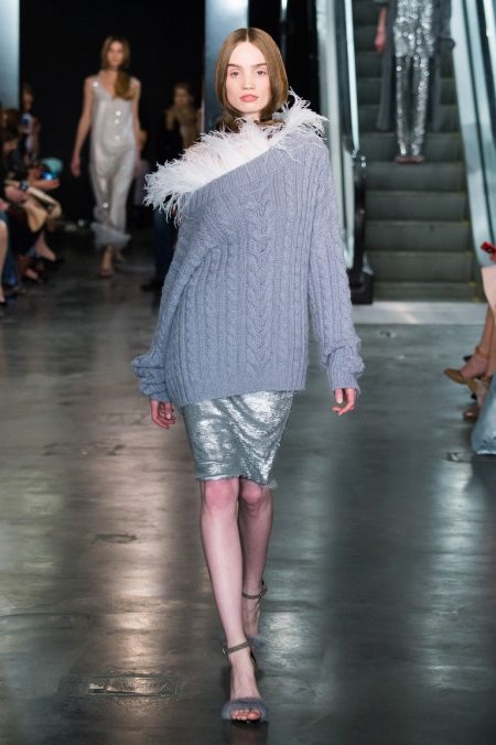 The evening look can make an openwork knitted sweater on one shoulder can be decorated with feathers along the neckline. Put on such a sweater a shiny pencil skirt sandals at low speed with a decor in the form of feathers. Such a set is good for an evening look.