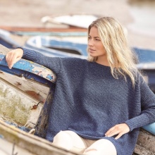 An elongated model of a blue knitted sweater with a long sleeve, with a free cut, will be an excellent option to use the jacket as a short dress. In combination with such a product tight tights are perfect, which can have any pattern. A stylish addition will be high black boots, a stylish bag and knitted beret.