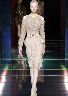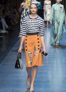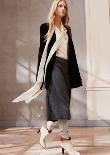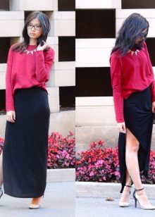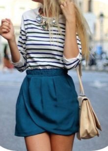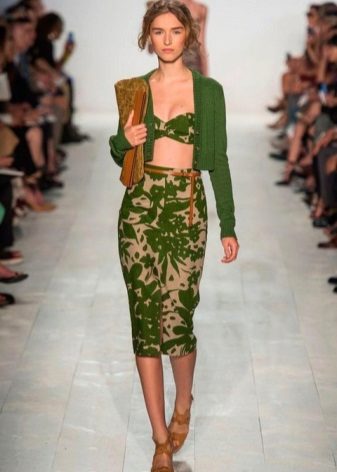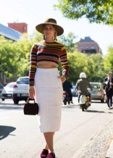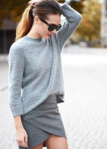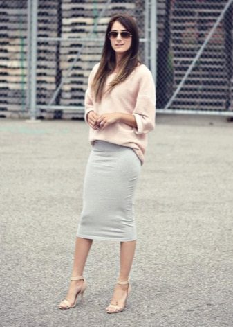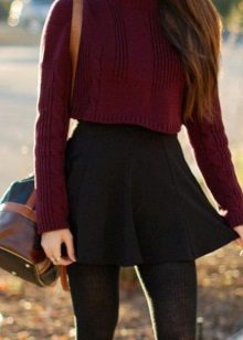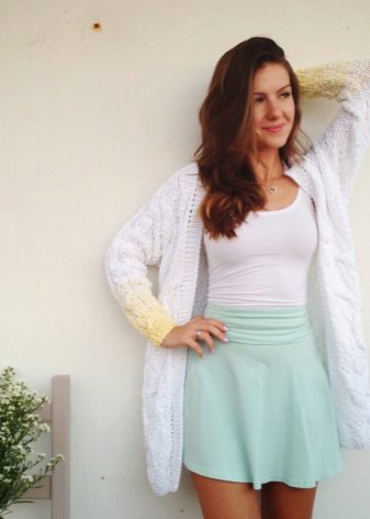 In order to avoid unnecessary volumes with a skirt cut the sun or a half-sun, it is better to wear a tight-fitting model of a jacket made of thin fabric, which should be tucked inside. Tight-fitting models of skirts or a short mini skirt allow for the use of a jacket made of thick knitted fabric and slightly elongated models, which will emphasize the line of the hips.