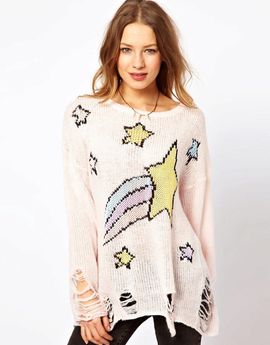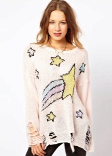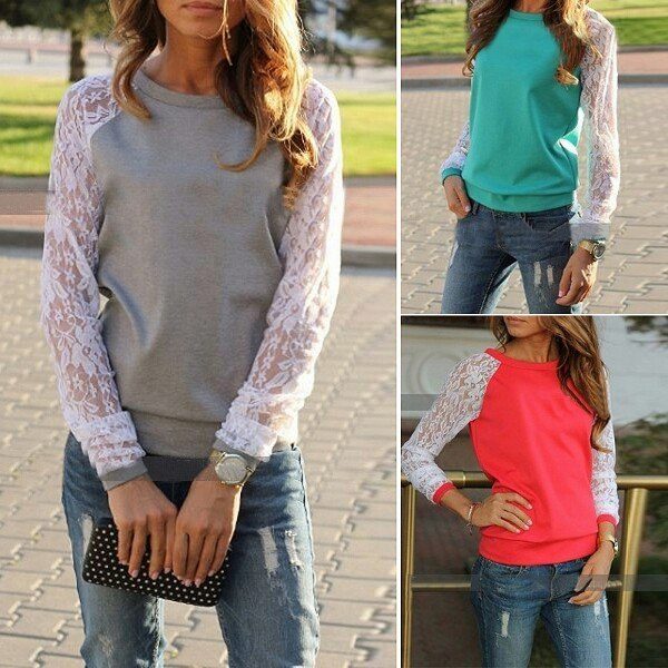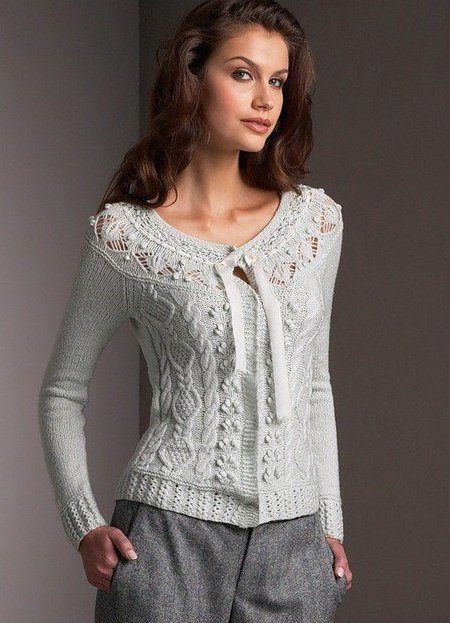 A popular option for a long sleeve sweater is the classic knitwear with lace sleeves. The front and back of such a jacket are made of gray knit fabric, and the sleeves are made of white lace. This model will be perfectly combined with light jeans and ballet flats of discreet, light shades.
