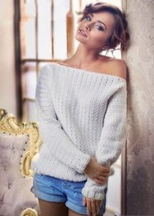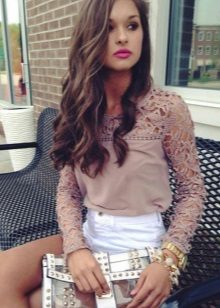 Short denim shorts will be perfectly combined with knitted models of long-sleeved sweaters, which can have a free style and slightly elongated bottom.