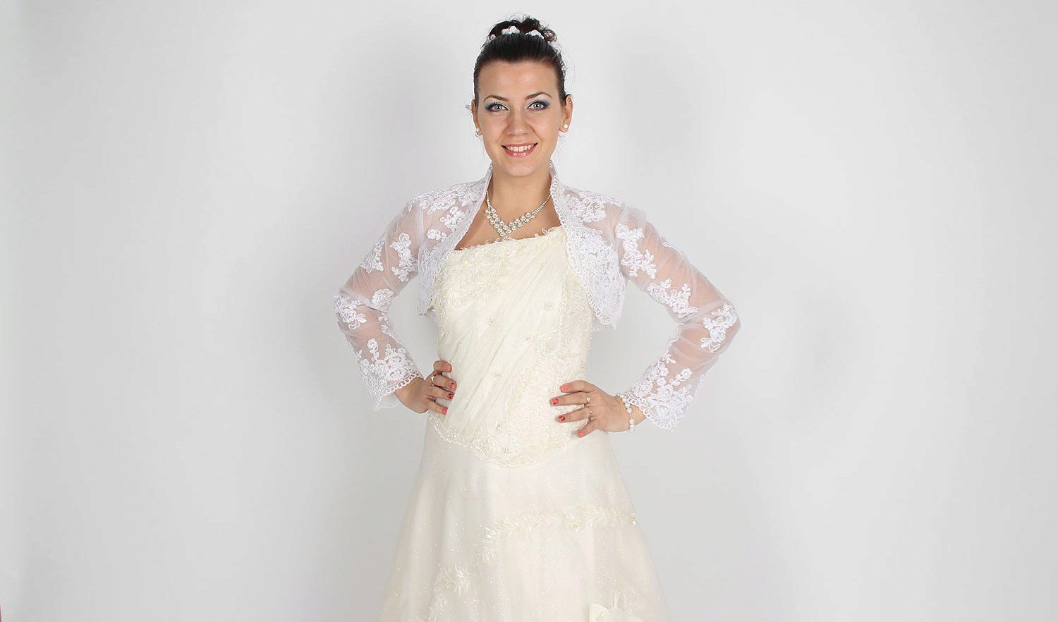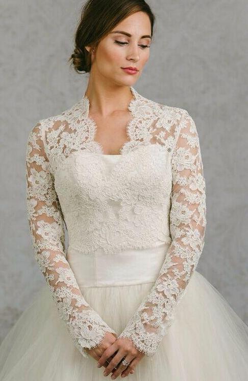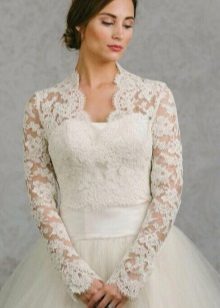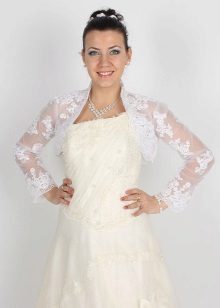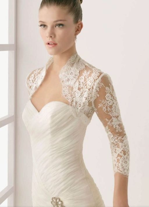Also, a bolero-type cropped sweater in the color of the dress is a favorite accessory for brides.