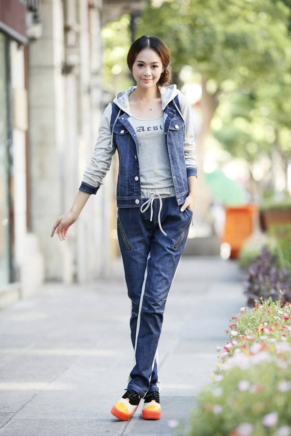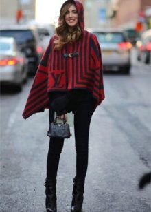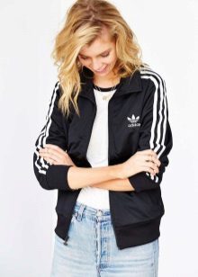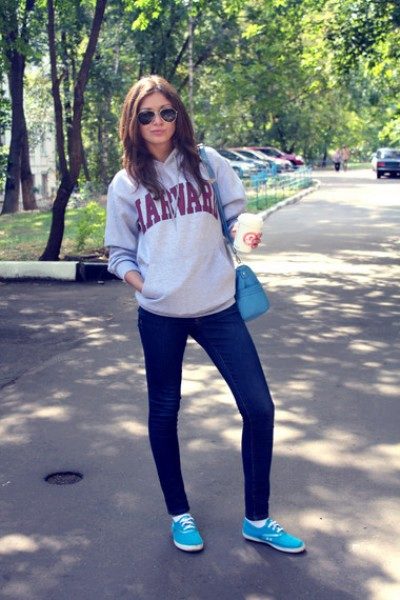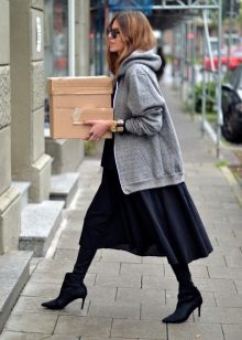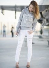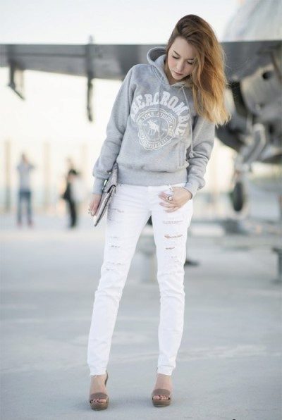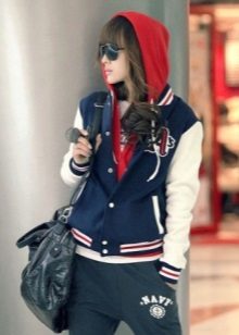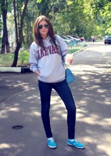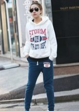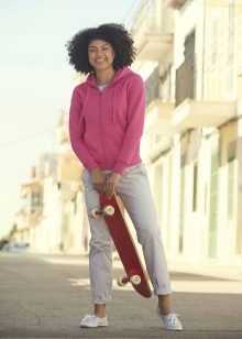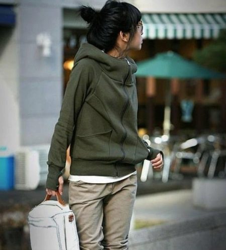 Since sweaters with a hood are a sporty style, they are not worn with either strict trousers or classic skirts. The most common variants of the ensemble with a jacket with a hood: