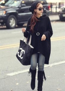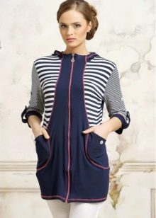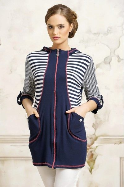 Long jacket This jacket in the presence of a special cut in the front pocket is called a kengurushka. It is often decorated with a bright print, lettering or sports emblem. It is also very common elongated feminine knitted sweaters. They are worn in the autumn in warm weather instead of a coat, wearing with skirts, trousers and beautiful boots.