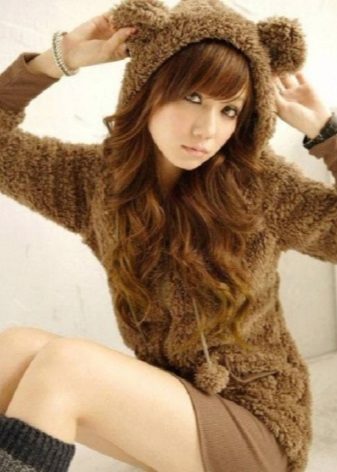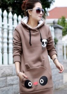 With ears and glasses on the hood. These sweaters look very cute and funny, so they are in demand among young people. Thanks to charming ears, the image becomes more feminine. This jacket looks good with jeans, and with a full skirt and leggings. As a rule, for the cool season fleece jackets with ears are offered.