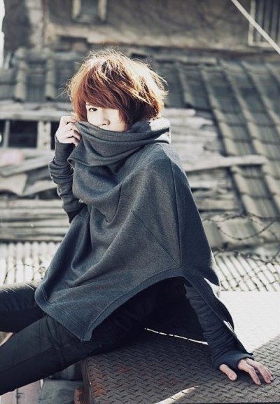 With a large hood. This loose sweater is often made of cotton and is called a sweatshirt or a hoodie. The large size of the hood makes such clothes comfortable and attractive.